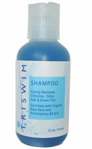 Tri-Swim Shampoo Ãs light citrus scent features Organic Aloe Vera, Vitamins A & E, and Pro-Vitamin B5, in addition, there are 5 sequestering agents that help in the removal of Chlorine and Chlorine odor! Tri-Swim is safe to use with all types of hair, including permed and color treated. Plus the shampoo gently removes the copper deposits that can cause some hair to take on a greenish tint. size: 2 oz.